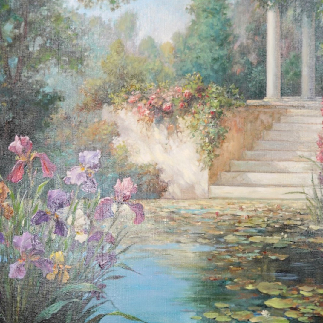 This painting depicts a beautiful romantic landscape with a picturesque pond filled with water lilies and the lush nature surrounding it. In the left foreground, irises bloom in soft purple, pink and yellow hues, giving the scene an airy and harmonious feel.