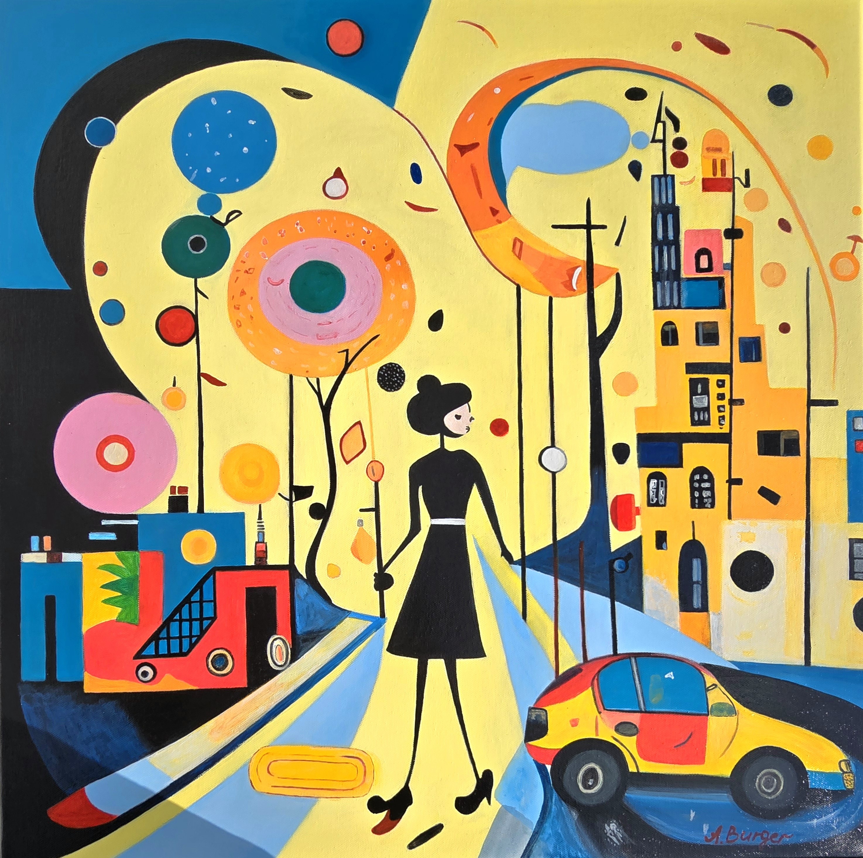 This piece draws inspiration from Wassily Kandinsky's style, with its bold colors, abstract shapes, and playful details, including red circles, orange bubbles, and black line art. It's an ideal choice for art lovers seeking a vibrant, expressive work that combines modern urban life with elements of abstract expressionism. Perfect for living rooms, home offices, or any space needing a burst of energy and color!