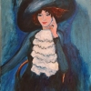 This painting shows an elegant woman in the image of the early 20th century - a tall black hat lampshade hides part of her face, making the image mysterious and aristocratic. The woman is wearing a dark blue dress with puffs and an accentuated snow-white frilled insert on the chest. The pose is given a slight relaxedness: her hand gracefully props up her chin, and a slight smile and thoughtful expression plays on her face. The palette of the work is maintained in cold blue, purple and black shades, and the romantic atmosphere is emphasized by soft, almost blurred contours.