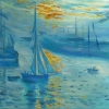 The canvas depicts a seaport or harbor in the rays of the setting sun. The water and sky merge in cold blue and light blue tones. The central place is occupied by a sailboat with bright white and blue sails reflecting the last orange flashes of the sunset. The effect of impressionism is manifested in the play of light and finely blurred silhouettes of other ships in the background. In the peace of reflections and soft brushstrokes, one can feel the dying day, filled with the romance of open spaces and the anticipation of the night.