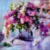 Before us is a flowing, airy still life — a luxurious bouquet of lilacs in a variety of colors: from snow-white and pearlescent to deep purple and crimson. The flowers are depicted with a slight blur, individual branches literally dissolve in gentle purple-blue shadows, and the glass vase glares deliciously. Green leaves add juicy accents to the work, and the scattered lilacs at the base of the bucket and soft drapery emphasize the home comfort and fragrance of nature. The painting is executed in a manner close to impressionism, and exudes the aroma of spring and lightness.