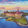 This canvas depicts an ancient fortress, proudly towering on a narrow island surrounded by water. Massive walls and towers with conical roofs are painted in the soft rays of dawn, and the sky plays with pink, lilac and blue shades. Smooth lines of the banks and the water surface give the painting a peaceful atmosphere. In the distance, islands are visible, and as a whole, the composition breathes history, strength, peace and the promise of a new day.