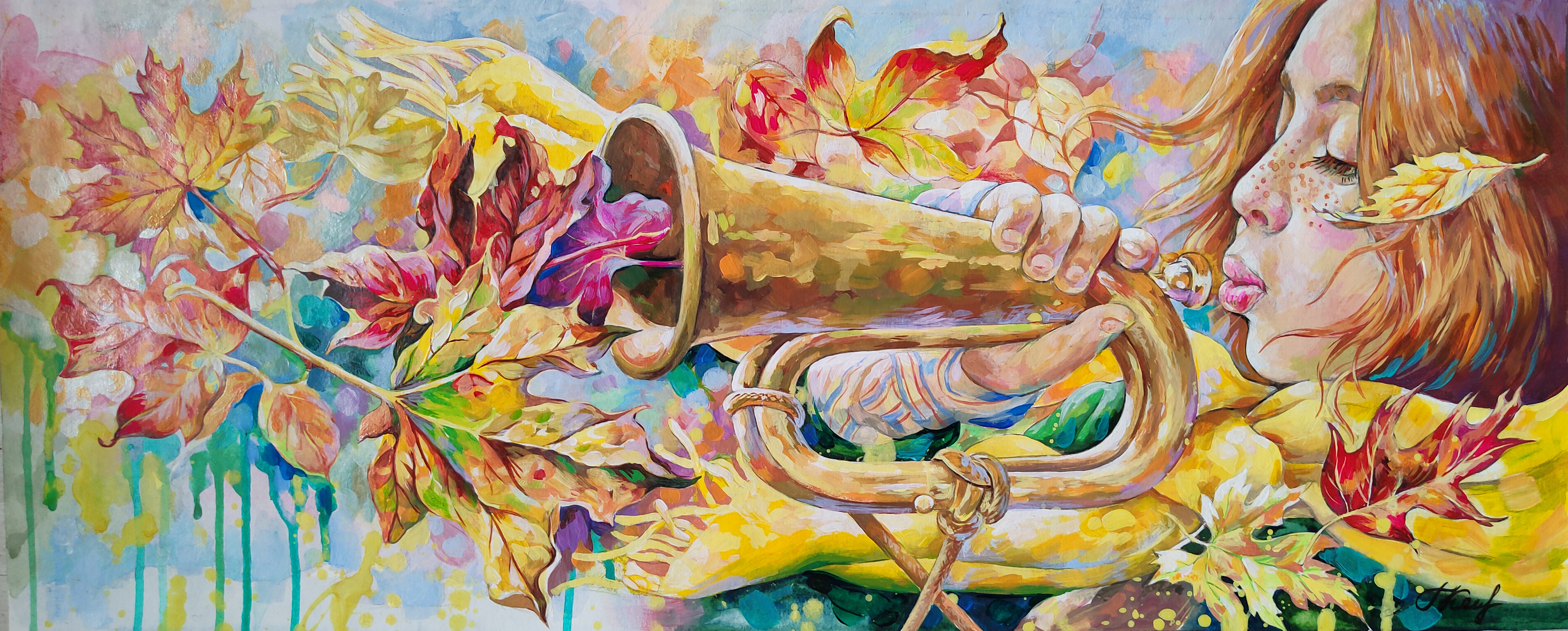 The painting depicts a girl playing a megaphone, from which instead of sounds the energy of autumn leaves oozes. The painting is full of bright warm colors that are associated with autumn: gold, orange, red and green. The girl looks dreamy and immersed in the process, and her red hair emphasizes the harmony with the autumn landscape. The leaves flowing from the megaphone seem to visualize sounds and emotions, conveying a sense of a living connection between a person and nature.