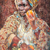 A woman in a bright national dress holds fruits as a symbol of harvest and abundance. Her clothes are rich in ornaments that emphasize the cultural flavor. The heroine's deep gaze and her pose create the feeling that she combines the past and present of her culture. The scarf on her head is decorated with complex patterns, and the bright accents of fruit and flowers in the foreground enliven the composition, paying tribute to natural beauty.