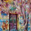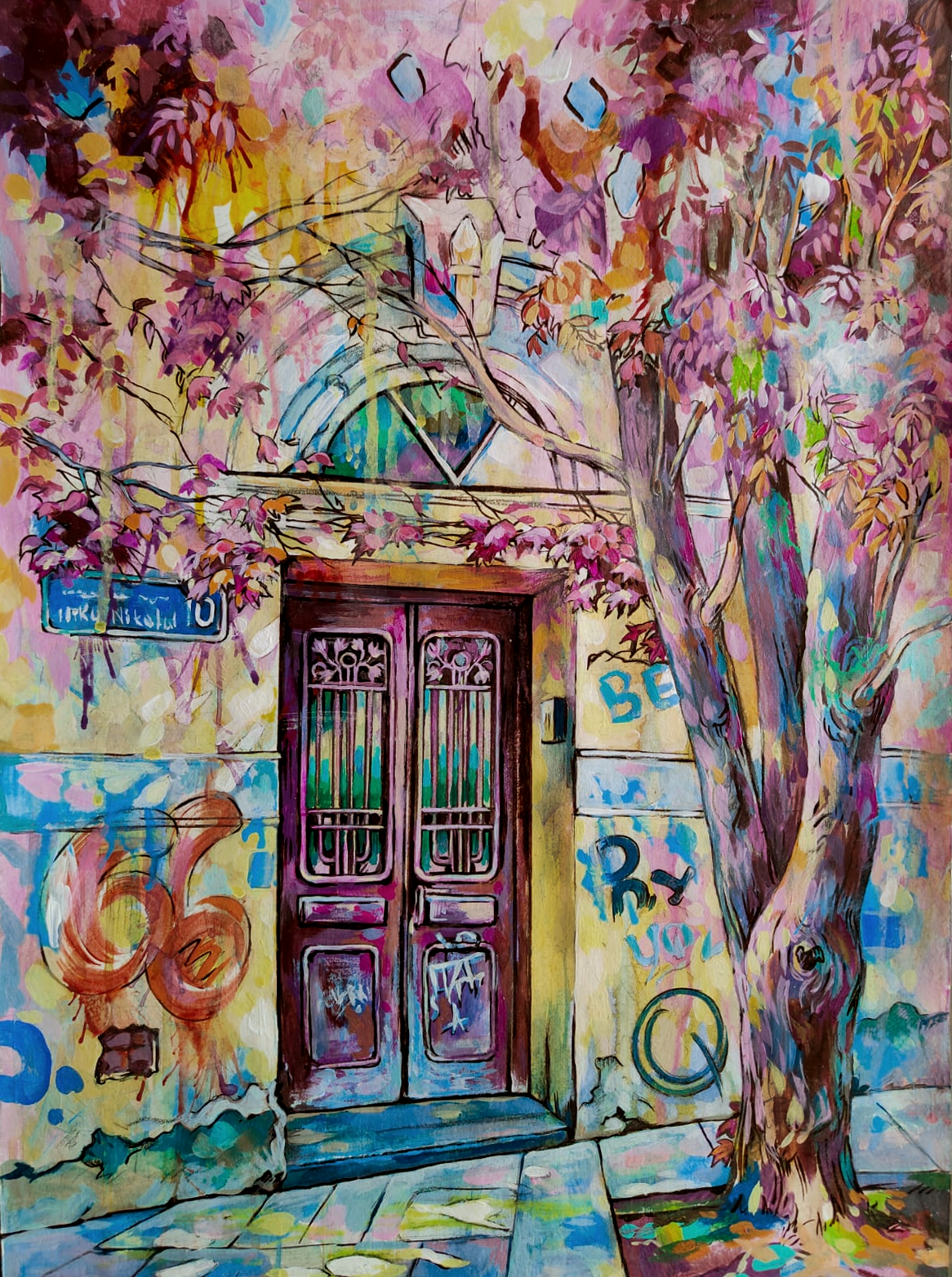 A picturesque door of an old building framed by tree branches. The foliage is painted in warm pink and purple tones, creating a sense of nostalgia and coziness. Graffiti is visible on the wall near the door, adding a modern touch. This combination of nature, human intervention and time turns the scene into a symbol of historical depth and beauty.