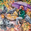 A girl in a warm jacket and holding an umbrella sits on a tree branch surrounded by crows. The painting is like something out of a fairy tale - the leaves in bright autumn shades enhance the mood of the transitional season. The crows, so realistic, create an aura of mystery and mystery of autumn. The girl seems calmly immersed in her own thoughts, and her interaction with the birds emphasizes the closeness of man and nature.