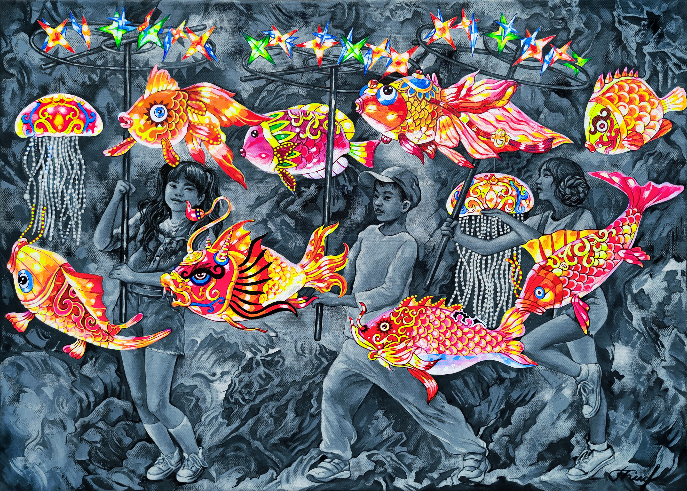 The central element of the composition is a parade of fantastic lanterns shaped like sea creatures. Among them, brightly colored fish dominate, rendered in a kaleidoscopic palette of reds, oranges, yellows, and pinks. These internally glowing lanterns seem alive, their scales and fins depicted with a high degree of decorativeness and detail characteristic of Asian art. The composition also features a jellyfish-shaped lantern, adding an exotic touch.