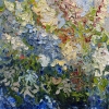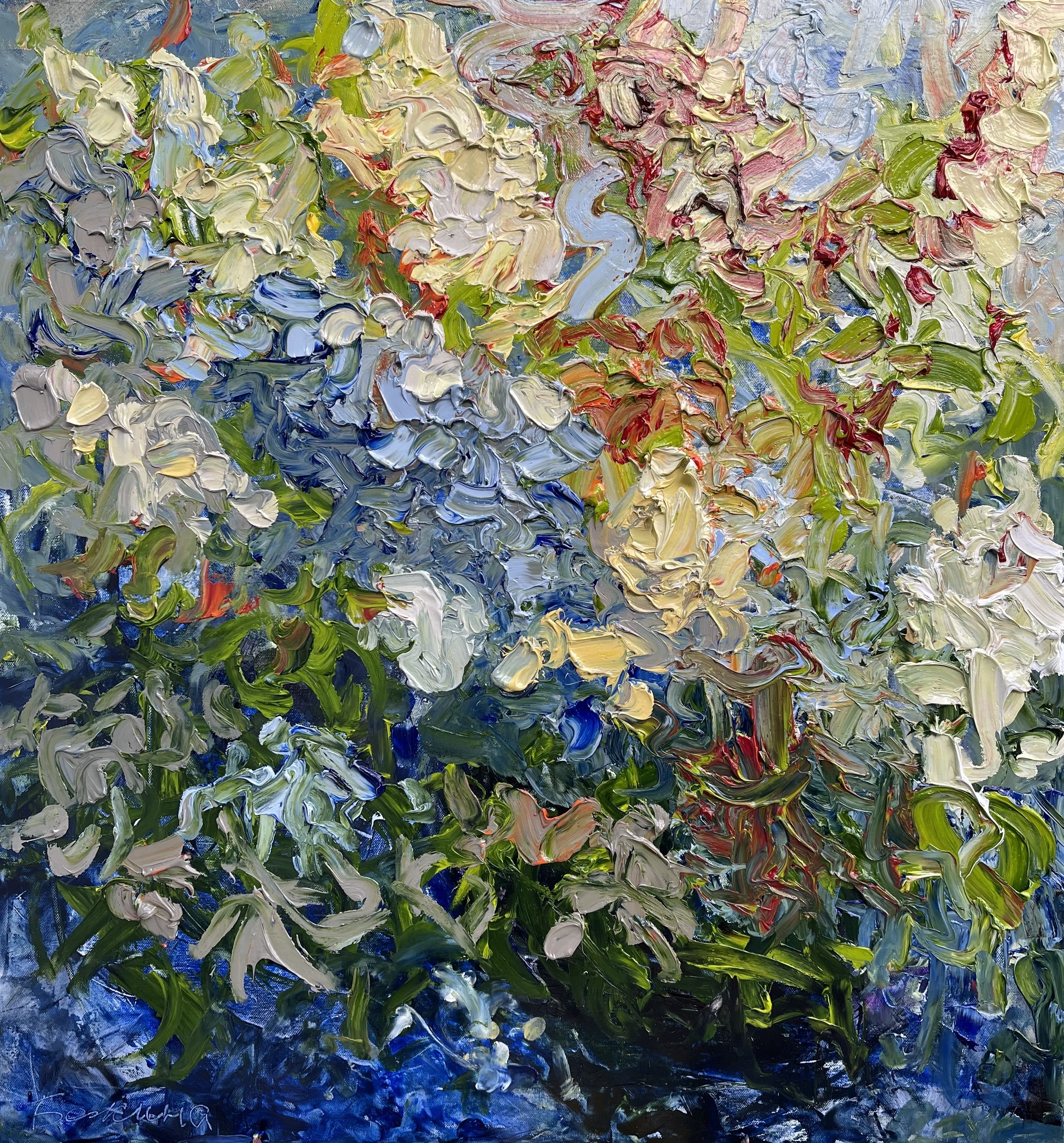 The painting "Cherry Blossom" is 95x90 cm in size, made on canvas with oil paints. The artist used large strokes of paint to convey the bright white cherry blossoms against the blue sky. The painting was created in spring and is filled with the light and joy of spring blooming.