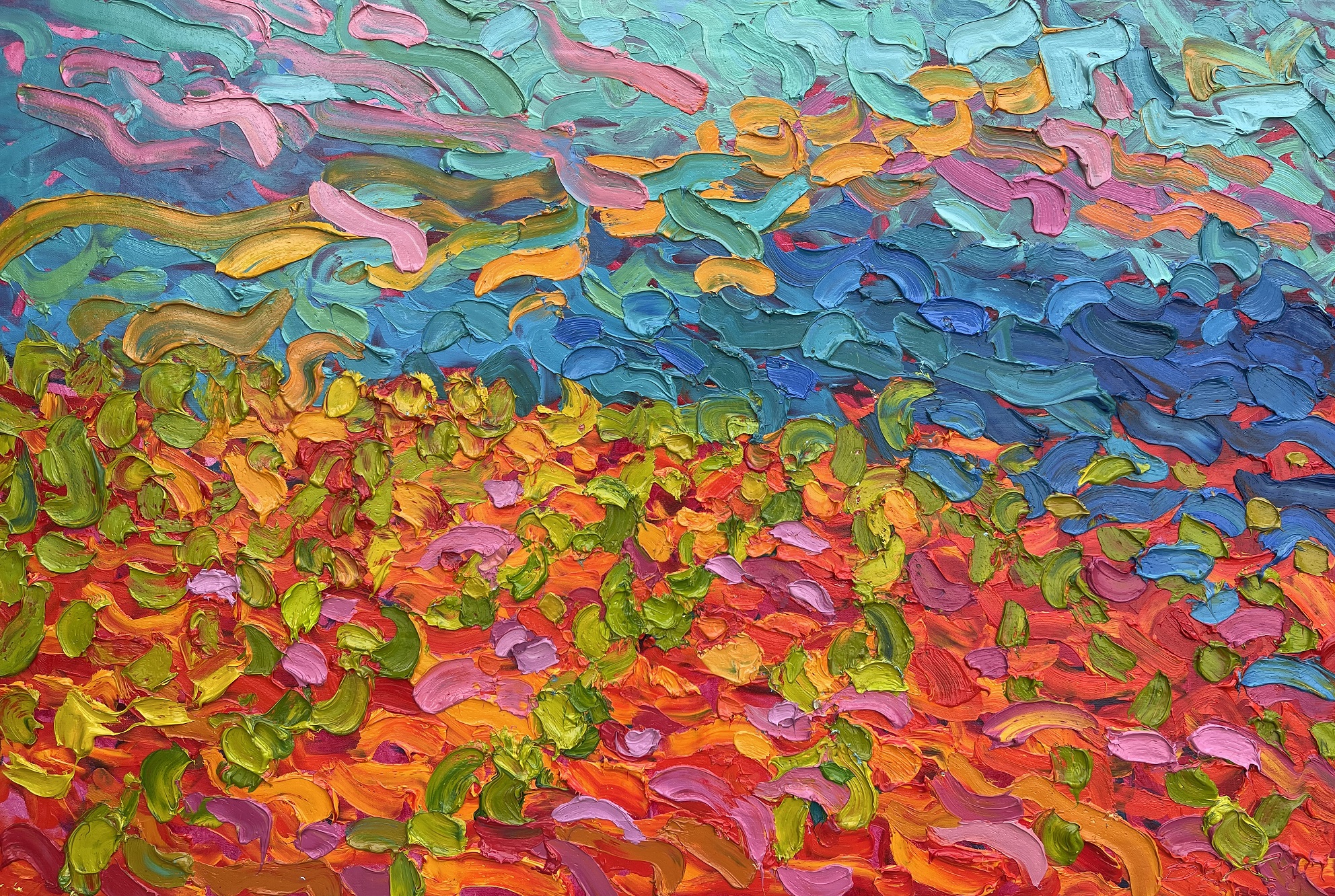 The painting conveys the atmosphere of a warm summer evening. A young vineyard illuminated by bright sunlight. In the background, behind the vineyard, there is a view of the estuary, and behind it you can see the hills of the mountains. All the elements of the painting are harmoniously combined with each other, creating a single picture of summer nature.