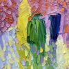 The painting "Three Colors" is not just a still life, but also an expression of emotions and feelings through the play of color. The central place is occupied by a tall yellow vessel, which stands out brightly against a pink background. There is a green vase nearby, which adds freshness and life to the composition. A blue glass completes the composition, creating a contrast with the rest of the elements. All objects are placed on the table, which adds depth and volume to the image.