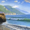 A calm seashore with large stones on the right; green slopes recede into the distance, gradually disappearing into the blue. Soft waves break near the shore, reflections of the blue sky and fluffy clouds are visible in the clear water. Somewhere in the distance, white birds fly by. Nature is shown in its true beauty - bright, spacious, imperturbable. This picture is about freedom, freshness, and all the power of the sea.