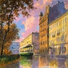 This painting can be hung on the wall of your apartment, house, office, restaurant, or hotel and will be a wonderful decoration for your interior. You can buy online the artwork "In the pre-sunset light after the rain. Turgenev Square. Petersburg." measuring 50 x 70 cm with free shipping to your location!