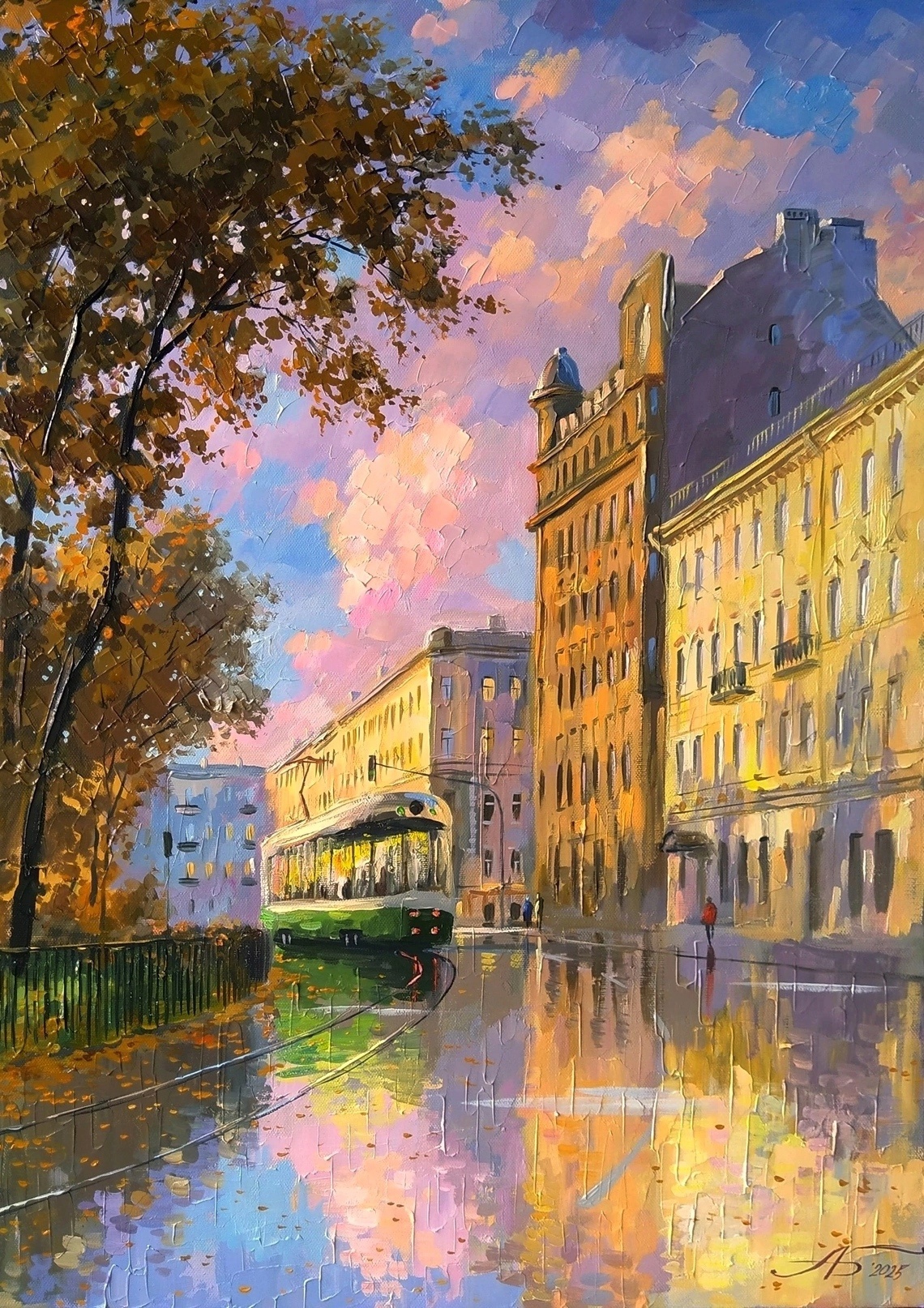 The center of the picture is occupied by a green tram, smoothly curving along the wet pavement. Tall buildings cast long shadows in the rays of the sunset, the facades sparkle with all shades of yellow, orange and pink. Above is a dramatic sky, saturated with clouds shining pink and lilac. In the foreground are trees with the remains of foliage. The asphalt reflects the sky and light, creating the effect of a living watercolor. The city is filled with freshness, the air is transparent, and in this moment there is a peaceful joy of everyday life.