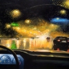 View from the car: against the background of the dark sky, the lights of a big city shimmer restlessly. The windshield is dotted with raindrops, lanterns, road signs, oncoming headlights reflect. The dashboard is illuminated with a soft bluish light. Spots of light on the wet asphalt seem to move, a comet rushing forward in the flow of cars. The painting conveys the dynamism and mystery of a night metropolis, the atmosphere of the road and the anticipation of adventure.