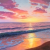 In the foreground is a sandy shore along which waves glide, reflecting the crimson-golden light of the sunset. The sky is strewn with clouds painted in pink, orange and purple shades, and in the distance, over the horizon, the sun is setting. A light wind drives the waves, seagulls soar in the sky. The picture fascinates with its harmony and tranquility, the seascape as a symbol of hope, eternity and the beauty of nature.