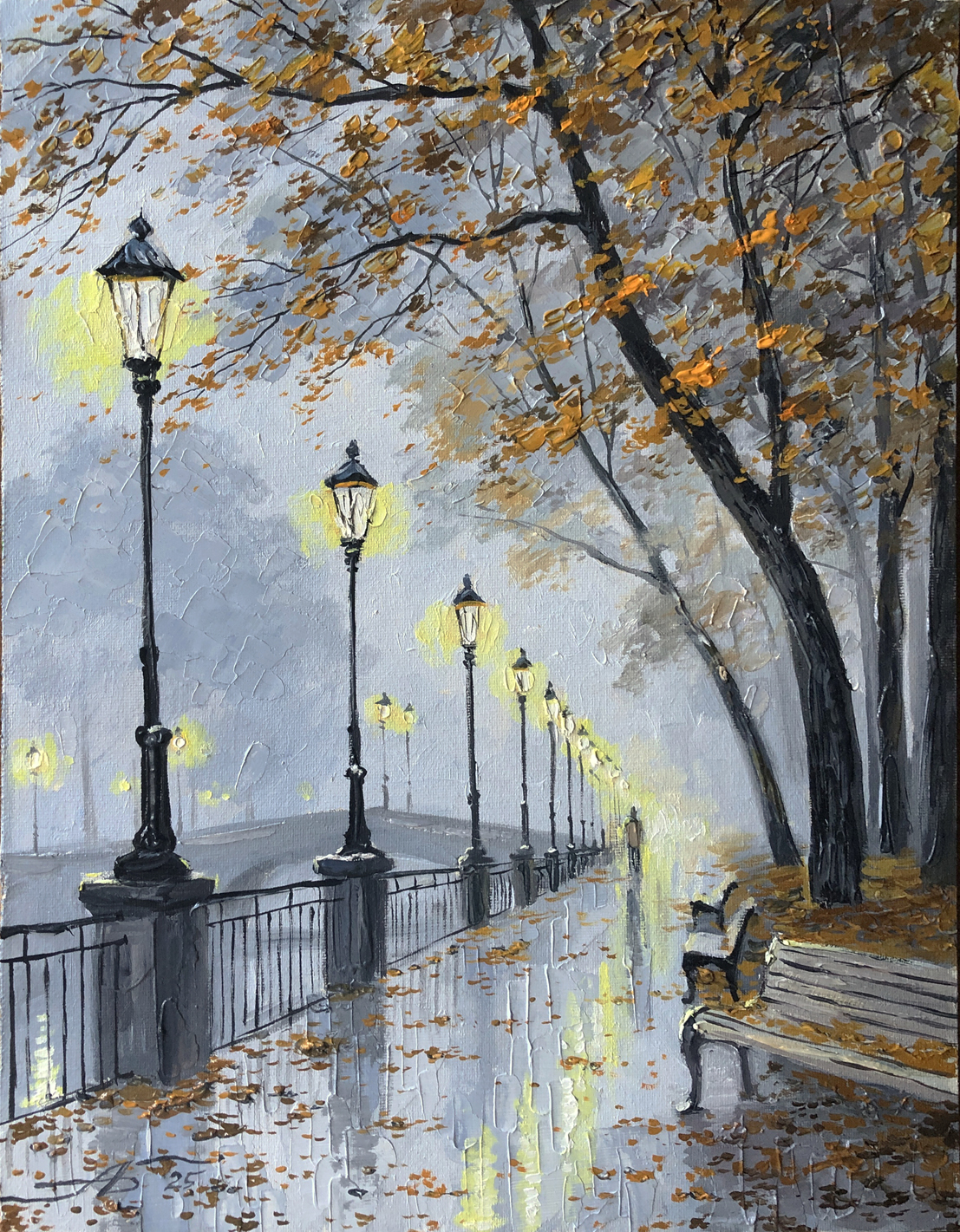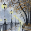 Пустота на набережной и влажная, отражающая свет поверхность усиливают ощущение уединения и тишины. Картина Александра Болотова передаёт красоту пасмурного дня, когда свет фонарей становится единственным источником тепла и надежды. Это классический романтичный пейзаж, воспевающий тихую, задумчивую красоту осени.