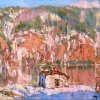 A panoramic landscape opens up before the viewer. A wide strip of snow runs along the foreground, with bright blue shadows in places setting off the whiteness. There is a small house with a roof covered in snow by the water, and a wooden canopy nearby - everything looks secluded, as if far from civilization. On the opposite bank there is a mountain range reflected in the water, their coloring combines terracotta-pink and emerald-green strokes, creating the illusion of a huge colored carpet. The mountains are bathed in the rays of the sun under the sky of a clear cold day. The entire space is permeated with clean air and silence.