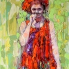 Before us is a portrait of a woman in the impressionist style. Her dress and headdress are painted with wild, thick strokes of bright red and orange colors. The figure seems to dissolve in a light green, abstract background, partially merging with the outlines of the woman herself. Her gaze, full of mischief, is directed at the viewer, one hand covers her lips. The painting is dynamic, the bold palette and picturesque texture evoke a feeling of energy, joy and freedom.