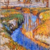 A small stream with bright blue water meanders between banks that have not yet completely thawed. On both sides are juicy green, orange and yellow spots of fresh foliage and last year's grass. In the distance are still bare or just beginning to turn green trees. The water reflects their slender trunks and the sky. Everything is painted with light, lively strokes, creating the mood of awakening nature.