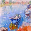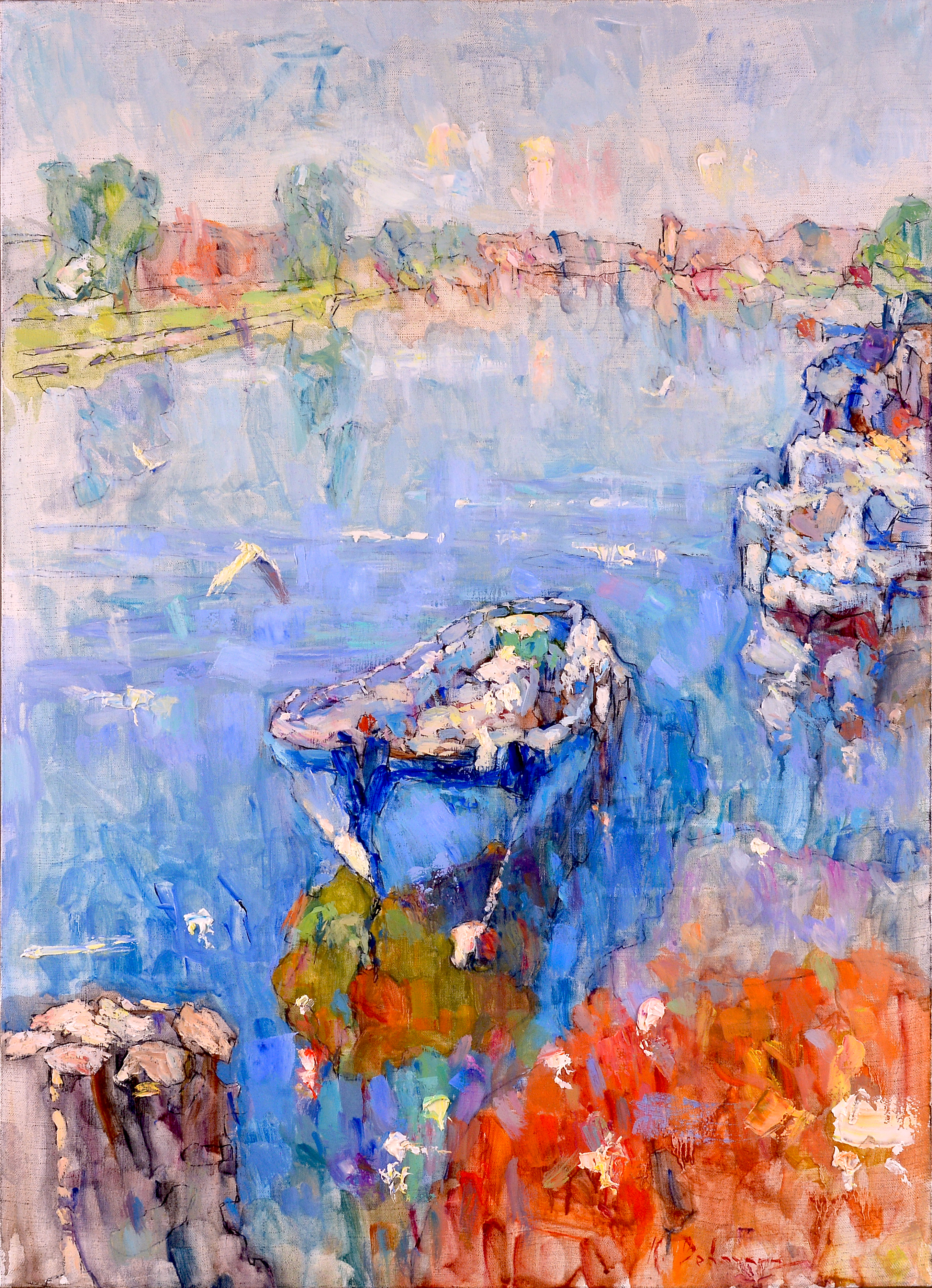 The foreground is occupied by a rocky, stony, grassy bank, where coastal stones and reddish vegetation are enlivened by sun glare. Below is an old moored boat, its hull almost merging with the aquamarine-blue shades of the water. Seagulls float along the surface of the river, and the vague outlines of trees and houses can be discerned on the horizon. Everything is painted with large impressionist brushstrokes, the picture is filled with space, freshness and a little melancholy.