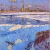 A panorama of a northern city opens up during the ice drift. In the background is the golden spire of the Peter and Paul Fortress and recognizable buildings of St. Petersburg. The river waters are still covered with large ice floes, they float on the blue surface, reflecting the spring sky with clouds. In the foreground is a massive embankment made of dark granite. The overall color scheme of the painting is cold, light, filled with pinkish and blue shades, conveying the freshness and coolness of early spring.