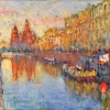 Before us is a view of a canal of a northern city, St. Petersburg. Tall classical buildings stand in rows along the water, in the center there is a reflection of the domes and spires of the cathedral, their outlines are blurred, flooded with sunset light. Boats are gathering on the water and near the shore. The palette of the painting is warm, with a predominance of golden, pink, blue and lilac shades. The composition is filled with dreaminess, pre-sunset silence and romance.