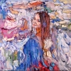 The central figure is a young woman with long chestnut hair, her gaze is calm, slightly dreamy. The surrounding space, a bizarre mixture of lavender, blue, pink, flesh and ocher strokes, draws in the portrait, making it part of the colorful elements - as if the girl is immersed in a whirlwind of clouds or a stream of imagination. The border between the portrait and abstraction is erased, the facial expression is mysteriously romantic, and the whole picture is imbued with quiet lyricism.
