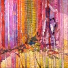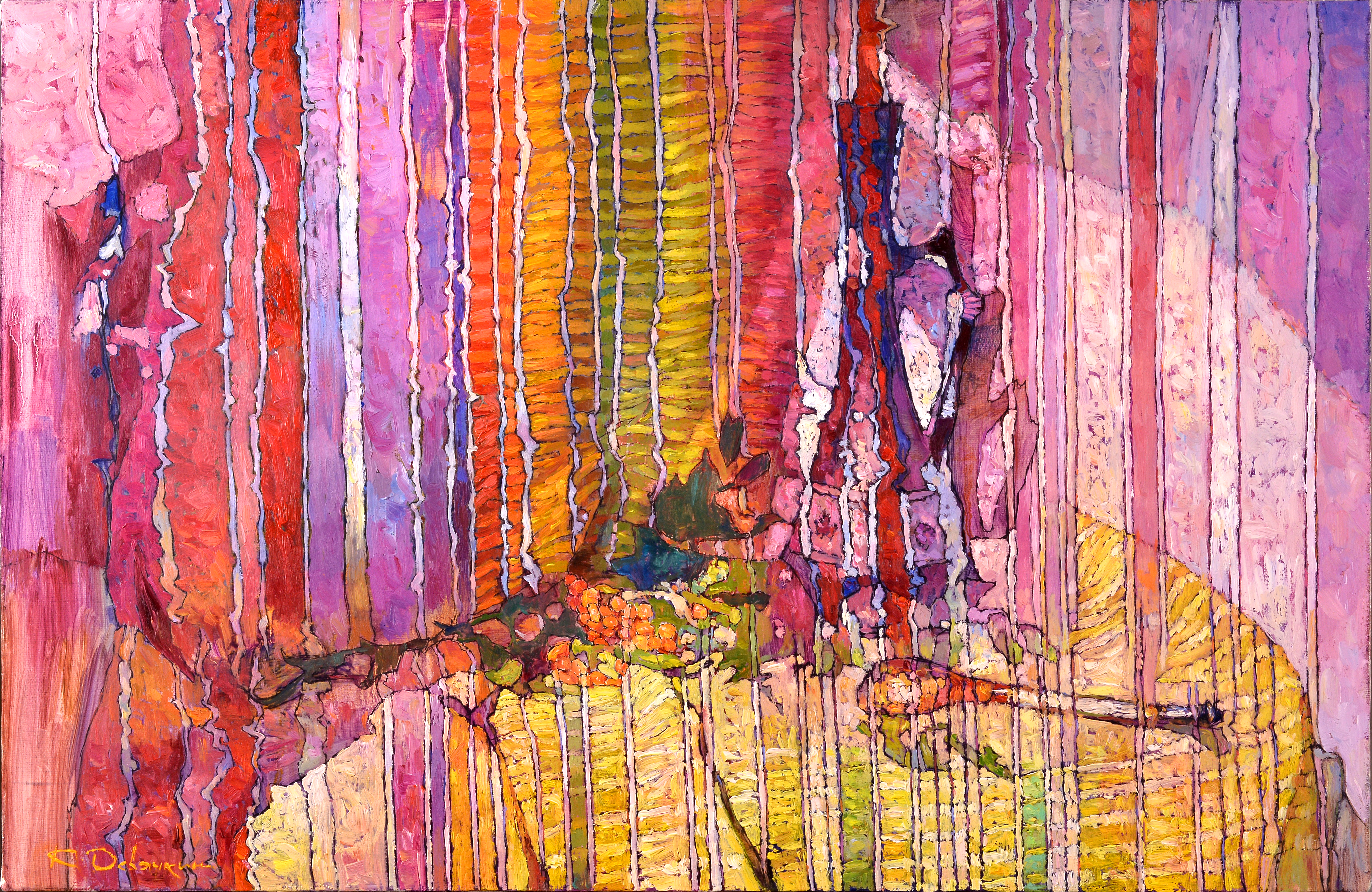 This composition is a celebration of flowers and lines. Vertical stripes of pink, crimson, peach, yellow and purple shades resemble fabric or flowing rain. Below, closer to the center, an invisible table can be discerned, on which lies a bunch of grapes, perhaps fruit, the silhouette of a glass. The entire space is covered with waves of rhythmically echoing brushstrokes, saturated with light and energy. The picture evokes associations with coziness, celebration and joy.