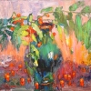 In the center of the painting is a glass or ceramic green vase filled with thick rowan branches with characteristic small bright orange lanterns. The branches grow in different directions, their large leaves, painted in rich shades of green and yellow, hang down and intertwine. The surface of the table or windowsill is also strewn with scattered rowan "lanterns", which brings a sense of chaotic liveliness to the composition. The main background is warm, consisting of soft pink, peach and ochre shades, which seem to illuminate and warm the entire scene. Bright brushstrokes, rich texture and dynamic arrangement of lines create a sense of free, emotional writing, as if the entire space is swaying in the sunlight.