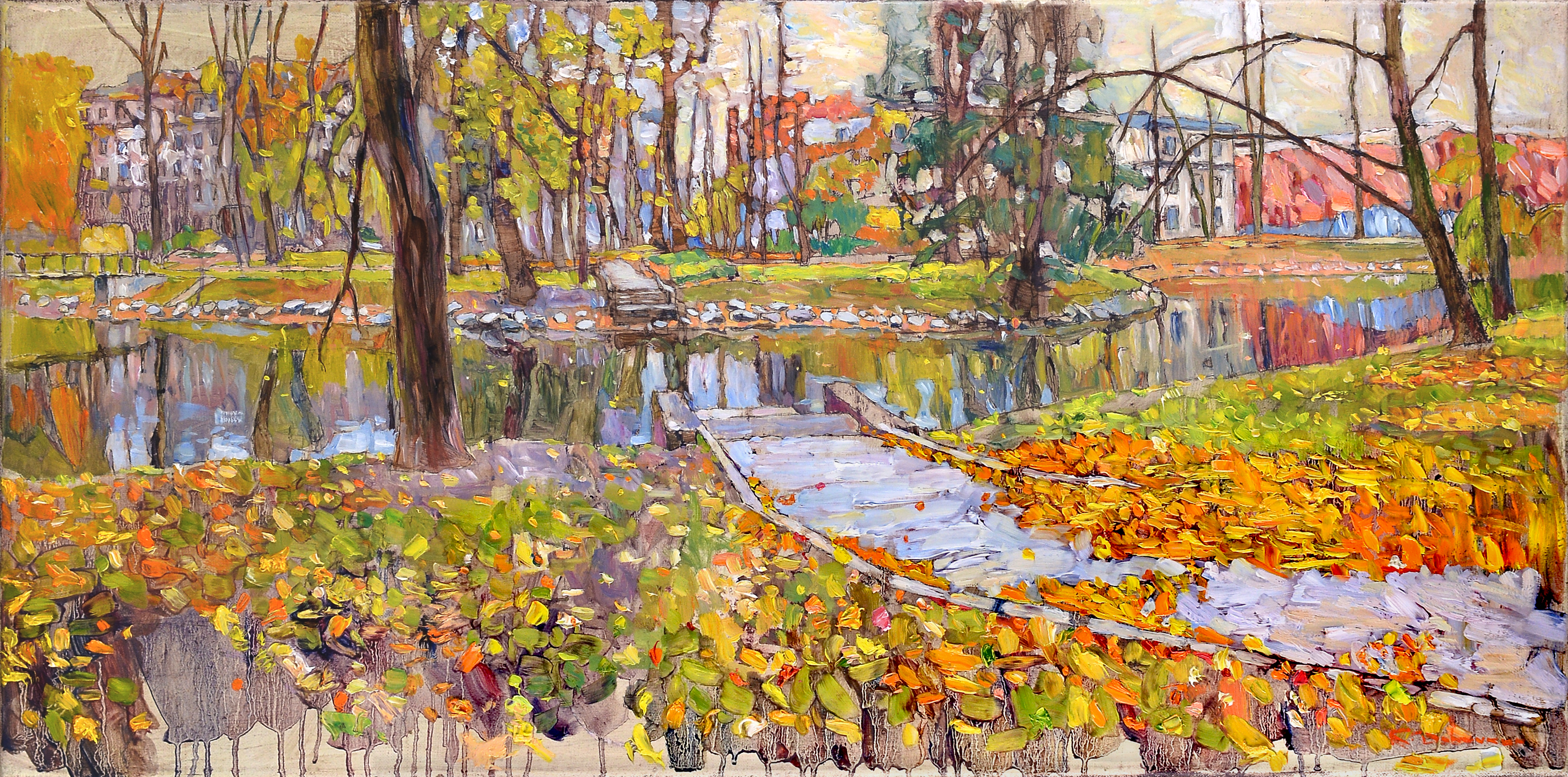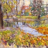 A city landscape in autumn tones opens before us. In the foreground is a path strewn with variegated foliage, leading to a wooden bridge over the calm water of a pond. On both sides are tree trunks with sparse foliage, thin birches; their reflections disappear into the mirror-like darkish water. On the opposite bank one can guess the city houses and a park, the sky shining through the branches, giving off a light-gray haze. In the distance is an elegant bridge, figures of people, orange and red echoes of the facades of houses. The atmosphere of the park is calm, melancholic, immersed in a slight withering and the beauty of the changing seasons. The palette is varied, each stroke emphasizes the movement of light, wind and coolness of the coming autumn.