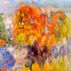 Above the water, there is a riot of autumn foliage. The trees, likely reflected in the water, are painted in bright, warm colors: fiery orange, vivid yellow, and gold. These colors create a sense of the peak of golden autumn, and their reflections in the water appear more fluid and elongated, emphasizing the picturesque quality of the water’s surface.
