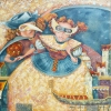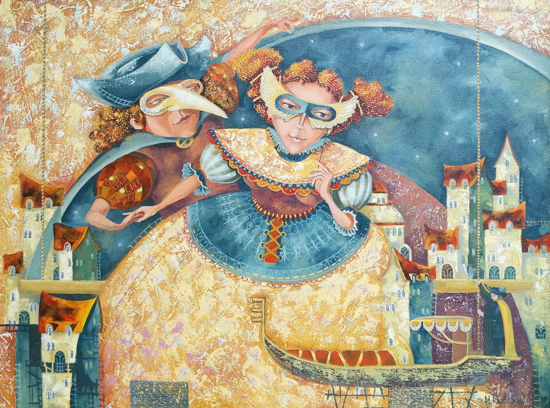 A bright, lively composition reminiscent of a scene from a masquerade theater. In the foreground are two characters in bright costumes and masks: one in a lush ball gown and a high hairstyle, the second in a wide-brimmed hat with a barrel over her shoulders. Their images symbolize day and night - one is bright, sunny, the second is more mysterious, nocturnal. Behind are stylized houses, towers, bridges, a gondola on a canal, like the scenery of a fairy-tale city. The whole world of the painting is filled with mystery, festivity, a sense of play and transformation. The golden-blue color scheme creates an aura of magic: day gives way to night, one mood turns into another, and life is full of amazing transformations. The artist invites the viewer to immerse themselves in a world of imagination and fantasy, where everything is possible.