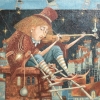 In the center of this fairytale scene is a musician in a top hat and rich suit, sitting on a large chimney among the sloping roofs of a night city. His legs are crossed, his toes are in brightly striped stockings, and in his hands is a violin from which a night melody flows. Behind is a deep dark sky, decorated with stars and a thin moon, and small stairs and lanterns stretch along the roof. The city is filled with lights that create an atmosphere of coziness and mystery. The mood of the painting is magical, slightly melancholic, as if the artist conveys a moment of silence and inspiration, when the whole world listens to the music of the night.