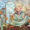 Before the viewer is a magical, slightly fairy-tale plot with an airy, bright atmosphere. The main character is a young birdcatcher with a gentle look, sitting on a wooden floor surrounded by miniature, cozy towns. Her soft blue dress harmonizes with the sky passing through the arch. The girl holds a small bird in her hands, and around her are many cages: some are open, some are empty. The expressive gesture of her hands and a slight smile hint at the joy of freedom and the joy of communicating with the living world. At the bottom left, sandals and a book are visible - symbols of lightness, knowledge and dreams. The entire background, filled with blue spots of sky, golden trees and fairy-tale houses with pointed roofs, creates an atmosphere of a kind sunny dream, where nature and human kindness are intertwined.