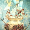 The first canvas depicts a fantastic flying city that seems to float in the sky. The composition is built around a huge ship with high-raised white and blue sails, transformed into the foundation for an entire town. Houses with red roofs and pointed turrets are inscribed into each other, creating the impression of dense development. Moreover, the ship does not just float in the air - it seems to be rooted in the branches of a tree, and the trunk of this tree (or a flow of energy) rests on dense earth, where other houses and architectural elements are visible. The background is made in azure-blue tones, dotted with golden and light inclusions: the canvas seems to be filled with moving light and air. The painting conveys a feeling of lightness, fabulousness, opens a window into a parallel reality, where it is possible to connect the earth and sky, dreams and everyday life.