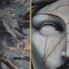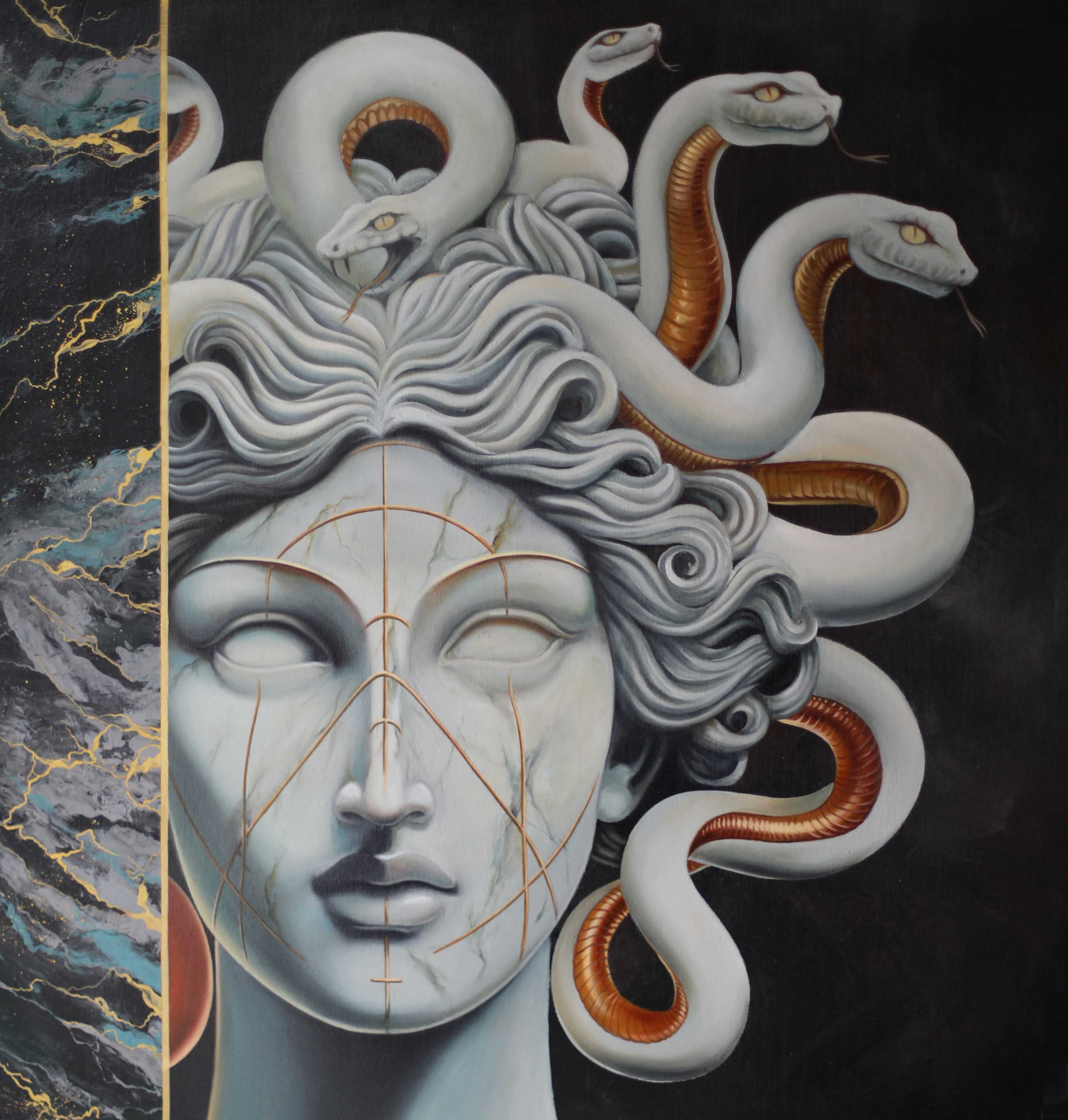 The background, executed in deep marble tones, creates a powerful contrast with Medusa’s expressive face, emphasizing every detail. The golden lines that run through her features seem to indicate the inner magic and mysticism veiled in this legend.