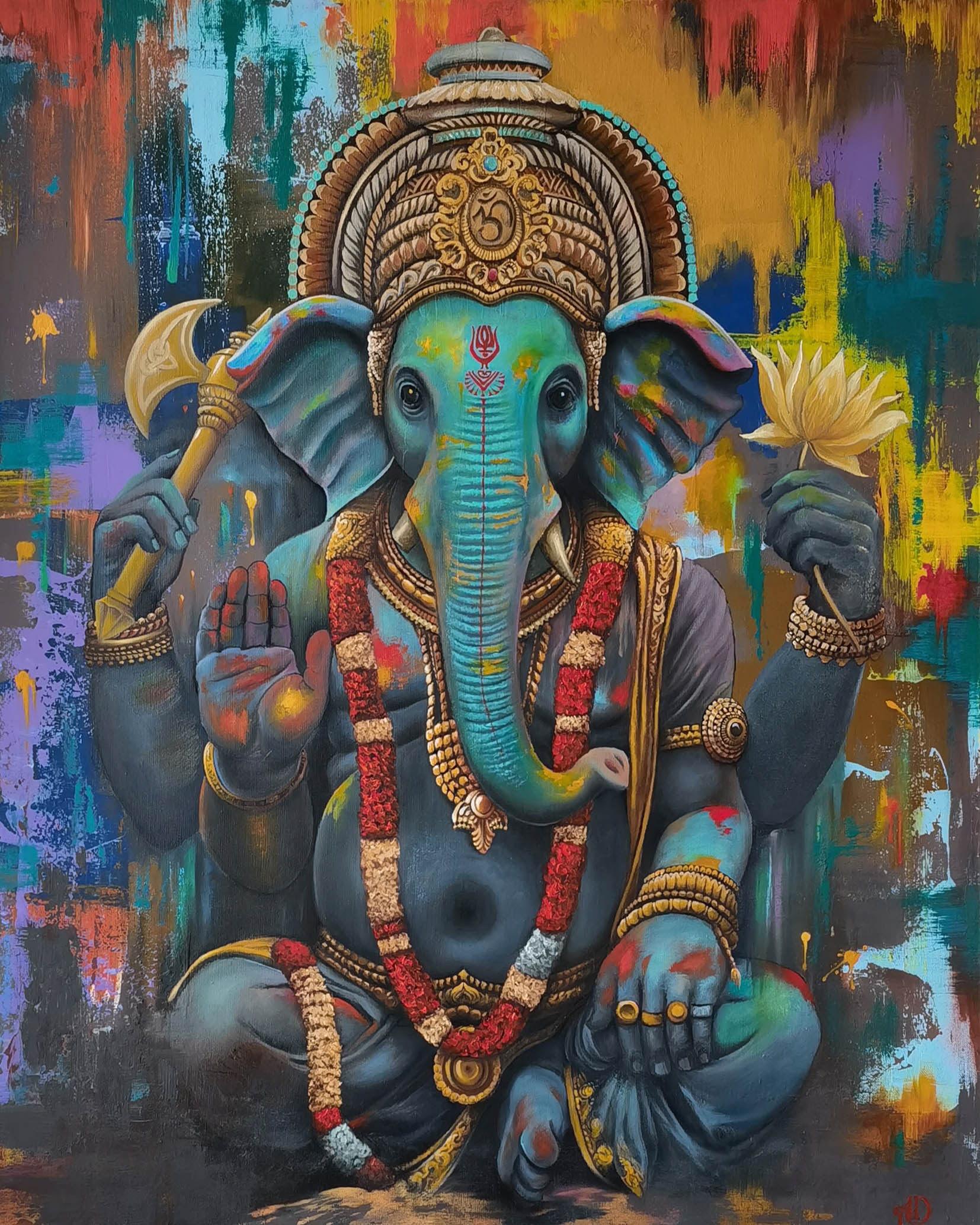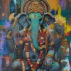 The canvas depicts Ganesha, the elephant-headed deity, surrounded by a vibrant kaleidoscope of colors symbolizing joy, harmony, and abundance. His radiant energy and kindness are expressed through warm shades of orange and gold, which create an atmosphere of coziness and light.