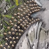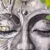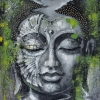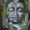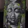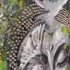 This work uses unusual materials: metal spikes. The textured painting seems to be covered with moss, which means it breathes.