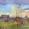This painting beautifully captures a serene rural landscape, likely set in autumn. The composition features a small wooden house with a weathered roof, nestled near a river or lake. A rustic wooden fence surrounds the house, and a lone horse grazes peacefully in the lush, green grass. Nearby, several haystacks secured with tall wooden poles stand, adding depth and texture to the scene.