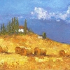 This painting beautifully captures a serene rural landscape bathed in warm golden tones. It depicts a vast field with hay bales scattered across the foreground, suggesting the end of a successful harvest. The rolling hills lead the eye towards a small white house nestled among tall, slender trees at the top, offering a sense of peaceful seclusion. The bright blue sky, adorned with soft white clouds, provides a striking contrast to the golden hues of the field, enhancing the feeling of tranquility and warmth. The artist’s expressive brushstrokes and rich texture add depth and movement, bringing the scene to life with a harmonious blend of colors and light.