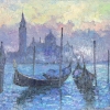 This impressionistic painting captures the serene beauty of Venice at dusk. Gondolas gently float on the shimmering waters, reflecting the soft hues of the sky. The silhouettes of wooden poles and the majestic architecture in the background, likely the Church of San Giorgio Maggiore, add depth and a sense of mystery to the scene. The brushstrokes are expressive, blending shades of blue, purple, and gold, evoking both tranquility and romance. The play of light and shadow gives the artwork a dreamy, almost ethereal atmosphere, transporting the viewer to the enchanting canals of Venice.