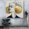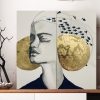 The diptych depicts a woman's profile with closed eyes, executed in shades of gray. The background is decorated with two golden circles, they create an atmosphere of mysticism and weightlessness. Above the woman's head, in her hair, a school of small black fish moves. Their thin lines seem to connect thoughts and dreams that flow freely and subtly. The contrast between the calm of the face and the dynamics of the fish adds depth and philosophical meaning to the image - this is a dialogue between the inner world and external reality.