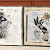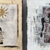 The photograph shows two square canvases in an ethnic style. The first (left) is a stylized female hand, decorated with an ornament, directed towards the sun, symbolizing the desire for light, life, culture. The second (right) is a silhouette of a woman in traditional African clothes and a headdress. Abstract brushstrokes of the background create the effect of ancient walls, emphasizing the eternal connection between man and his history. These works reflect the author's admiration for the beauty of African traditions, feminine grace, and the warm energy of the sun.