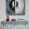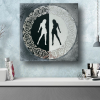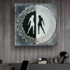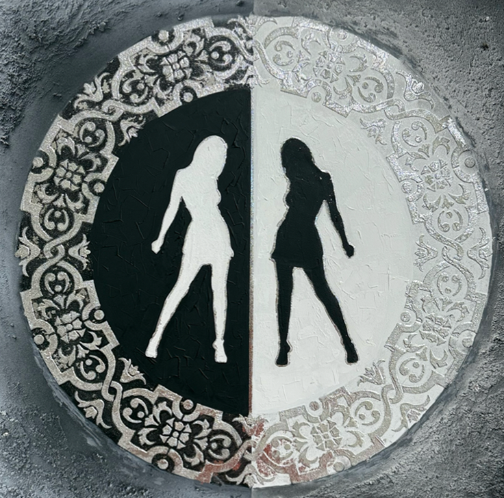 The painting is made in the form of a circle divided in half: one half is black with a white female silhouette, the other is white with a black silhouette of a girl. The frame is decorated with a complex ornament reminiscent of lace or oriental decor. The painting symbolizes the harmony of opposites, the balance of light and shadow, female beauty in all its manifestations. The circular ornament complements the plot, adding a touch of sophistication and unity.