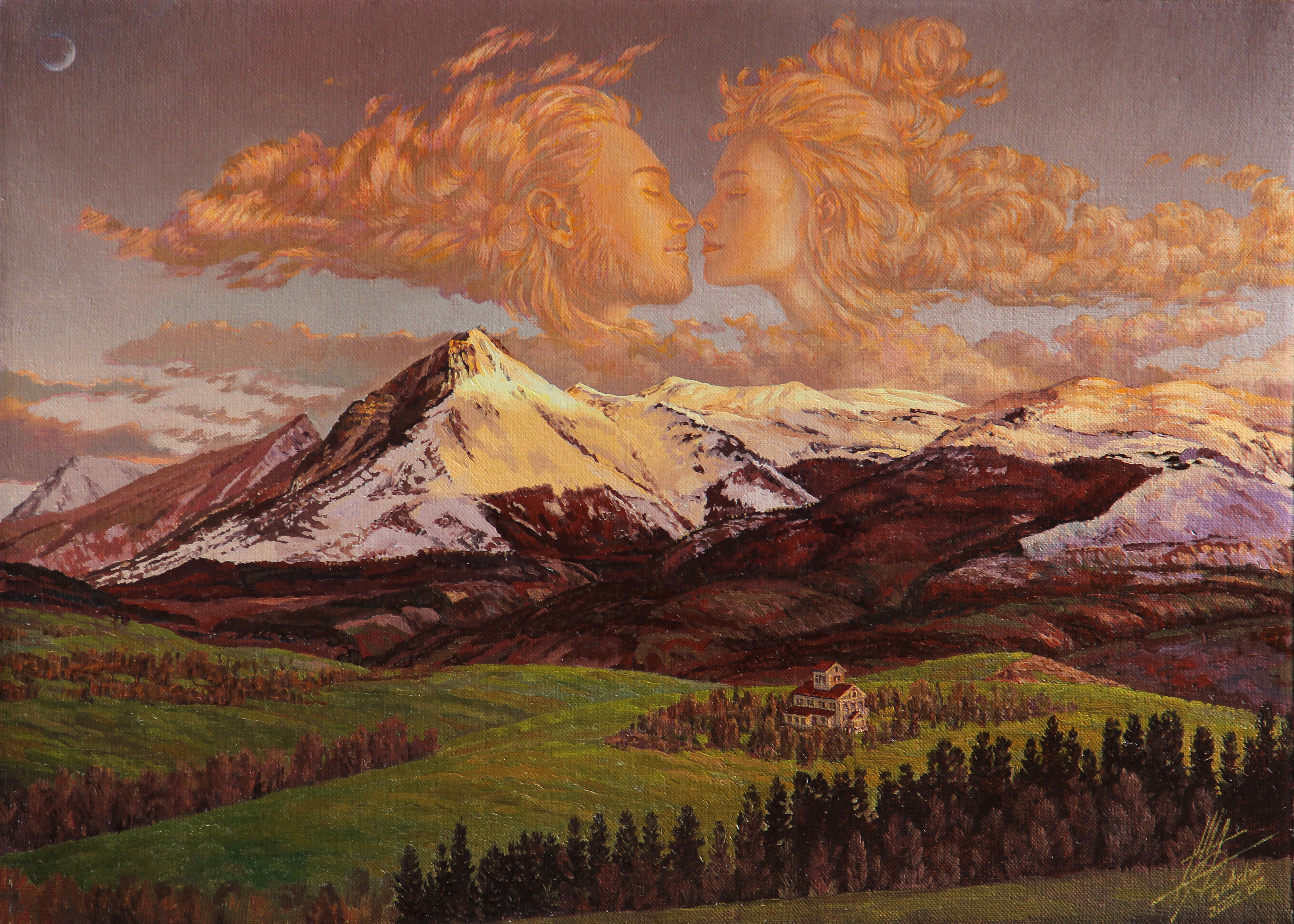 The work is filled with peace and tenderness. Against the backdrop of picturesque snow-capped mountains and a green valley, two clouds in the shape of human faces rise up — a man and a woman reaching out to kiss each other. The houses below, among the forests and meadows, create a feeling of home comfort and security. This painting seems to illustrate how love is in the air, filling the whole world, uniting heaven and earth. The light poetry and dreaminess of the plot make it a symbol of romance and harmony.