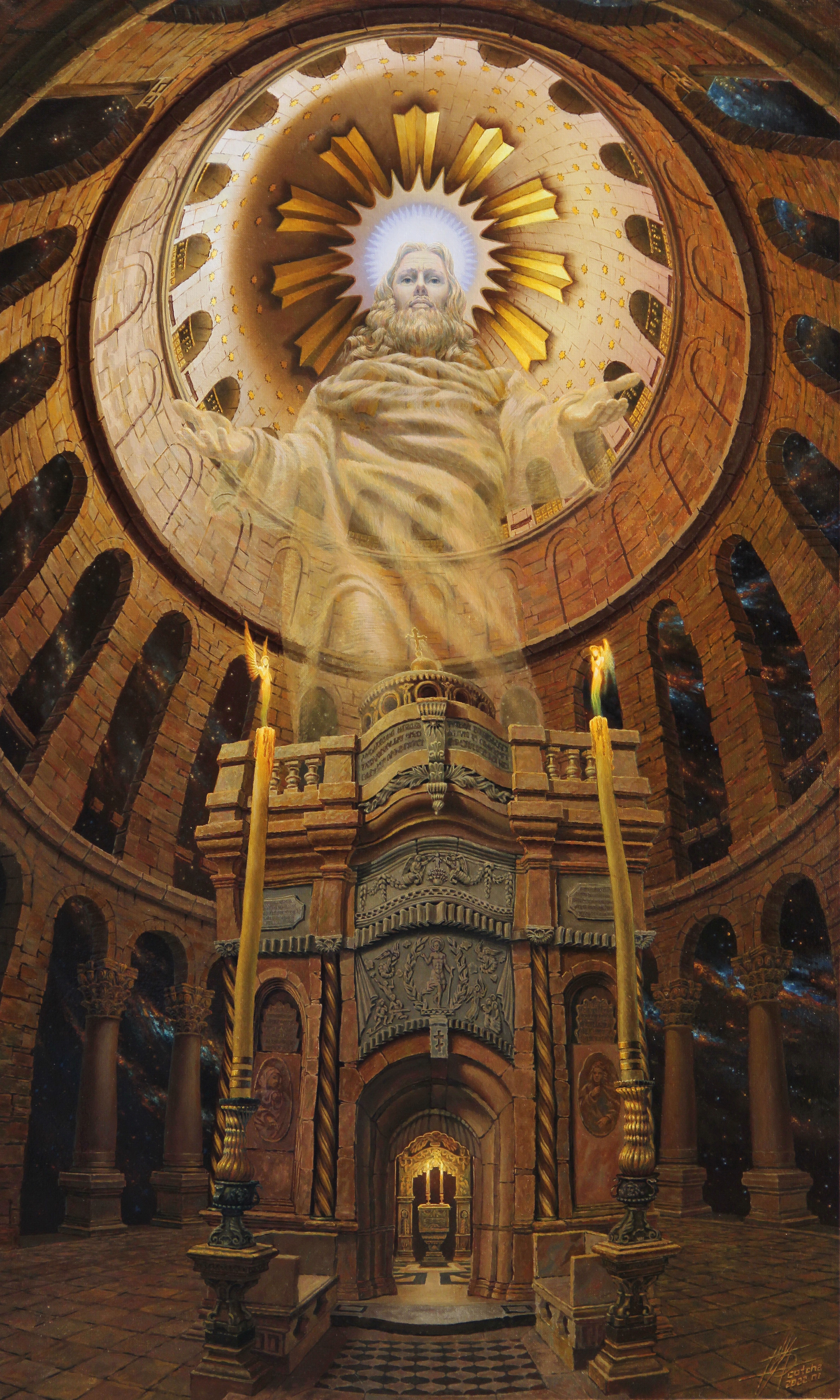 The painting seems to open the gates of a temple or cathedral to the viewer, in the center of which a majestic image of a divine being appears, shining with gold and light. A figure in long robes, with a radiant halo, as if built from clouds and secret energies, hovers under a massive dome filled with the symbolism of Eternity. Below is an artfully decorated altar, blazing candles. The entire space is permeated with light, not only earthly, but also cosmic - as if the temple is at the junction of worlds. The painting speaks of holiness, mystical experience, the meeting of the earthly and heavenly.