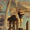 А visual poem about transformation, power and beauty. Against the backdrop of a mysterious sky with swirling clouds and the tortured surface of the earth, ancient columns rise, some are destroyed, some are rushing skyward to the moon, which is also beginning to crumble. A ballerina is dancing on one of the columns, frozen in an elegant, airy pose. Her grace stands in stark contrast to the ruins and the bizarre, surreal creatures below, as if they belong to another dimension. This is a scene about the eternal pursuit of beauty against the background of destruction and change, about the desire to soar above the limitations of the world.