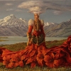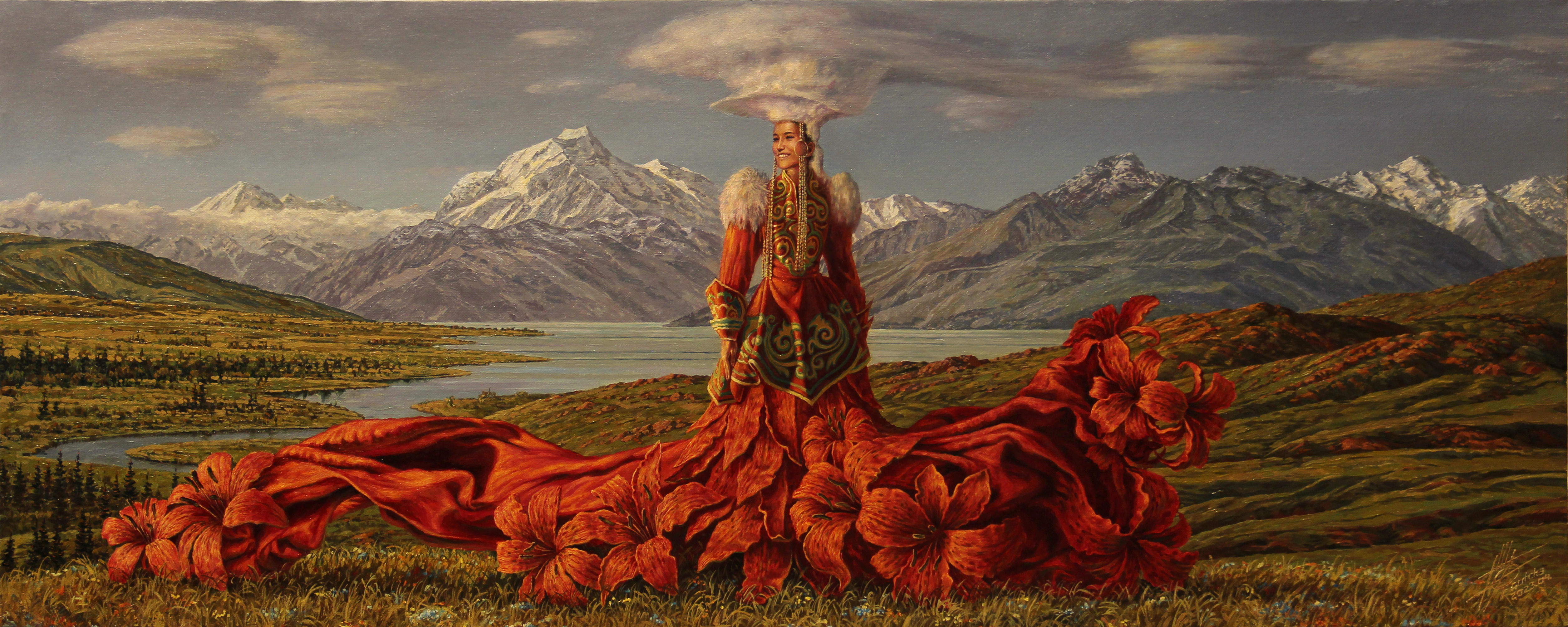 The main character is a proud woman in a long Russian dress with a luxurious train-carpet, scattering along the ground with bright red flowers, as if enlivening the grass against the backdrop of mountain landscapes. A fluffy fur cape, a unique headdress and a slight half-smile emphasize her connection with nature, her regal power and protection of the beauty of this land. The background white peaks, lakes and the expanse of the steppes create a feeling of space, grandeur and harmony between man and the earth.