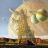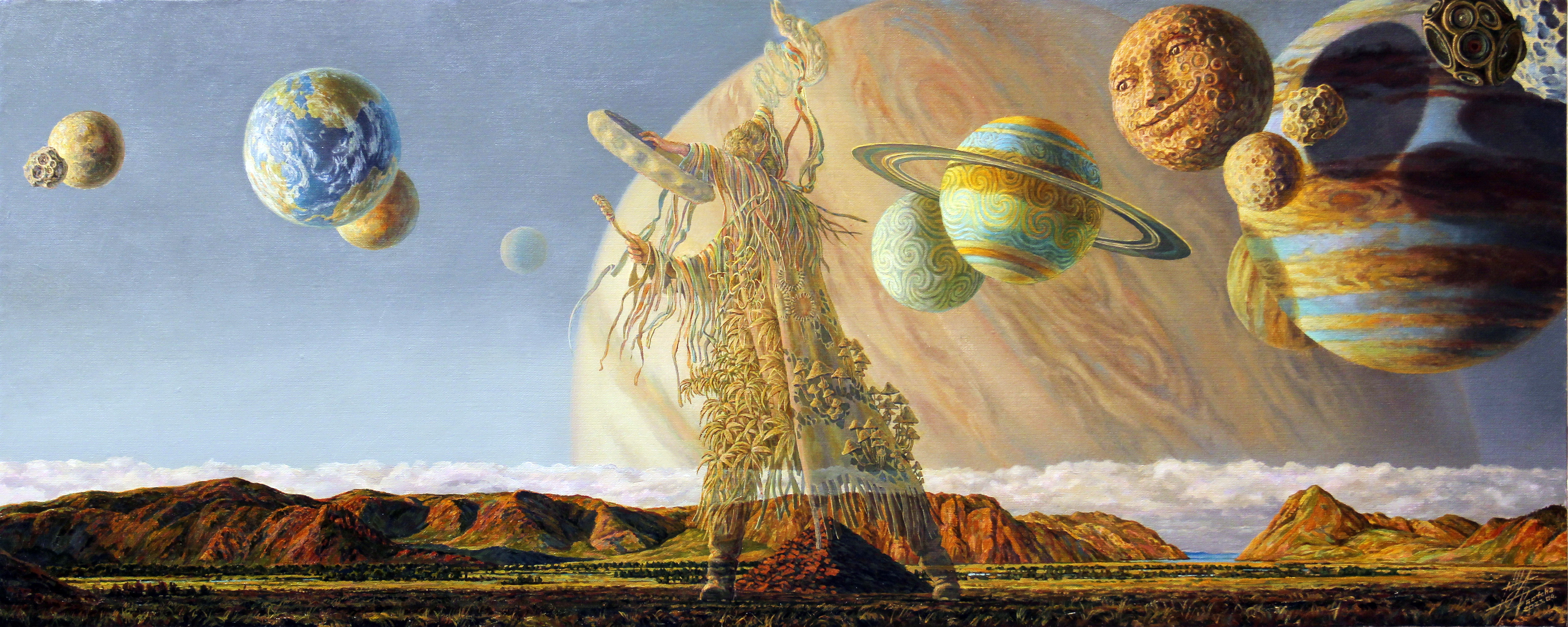 A large-scale cosmic canvas appears before the viewer: above the earthly mountains, against the backdrop of a huge planet and many celestial bodies, a transparent figure of a woman - she seems to grow from the earth, connecting worlds. Her body is formed by trunks and branches, as if she is a goddess of nature or mother earth, raising her hands to meet the planets. Around her float the Earth, Saturn, Jupiter and other planets, some of which have spiritual faces and expressions. It is an ode to Universal connection, the power of life, the eternal dance of the Cosmos and Earth.