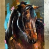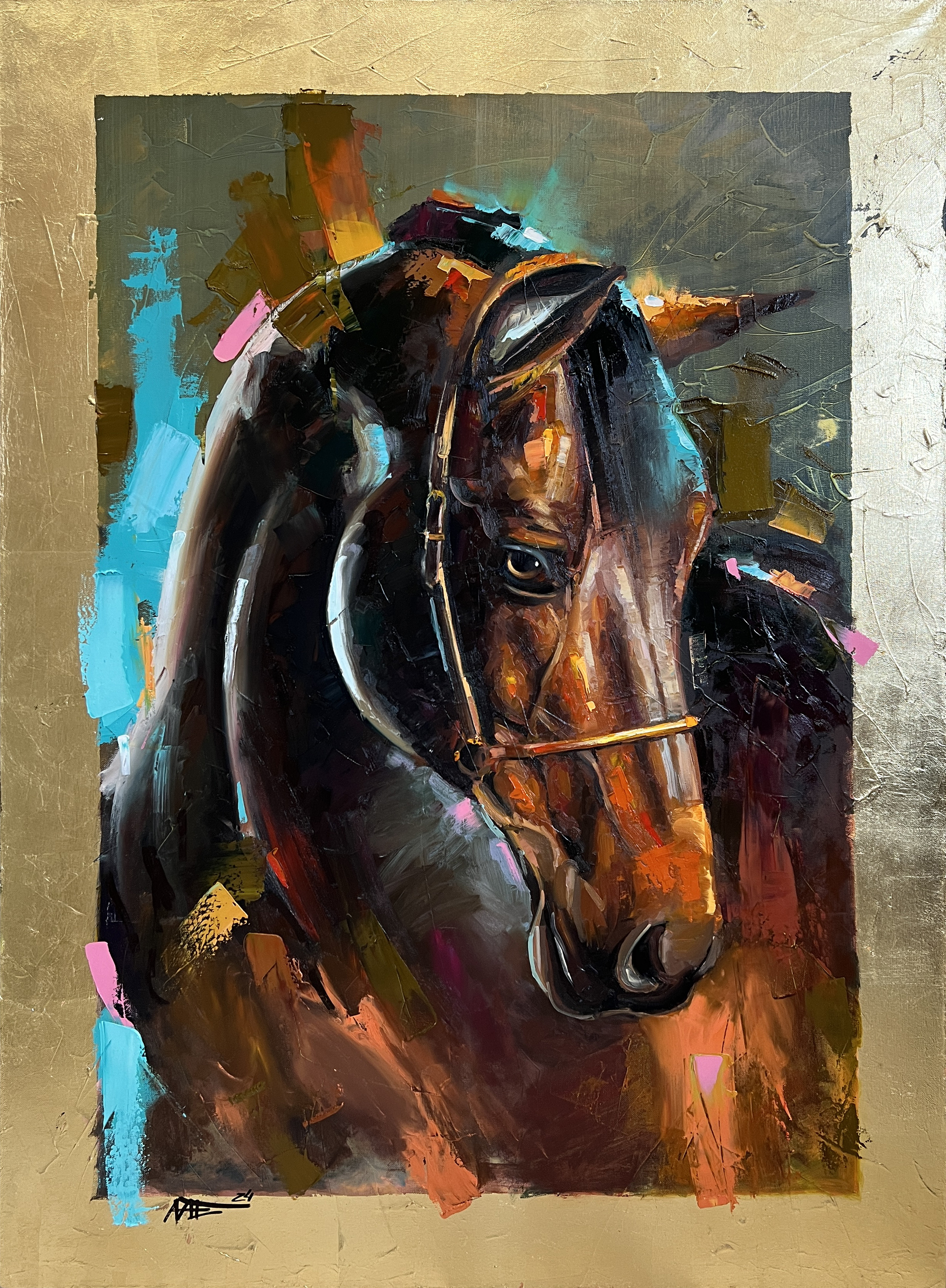 The painting depicts a portrait of a horse, made with an emphasis on its strength, grace and nobility. Clear, energetic brushstrokes emphasize the texture of the coat and the muscularity of the animal. The mood of the painting is conveyed by the contrast of warm and cold shades, creating a simultaneously realistic and abstract effect. The horse is depicted in semi-profile with a thoughtful look, symbolizing loyalty and power. The golden background gives the work a solemnity and a sense of grandeur.